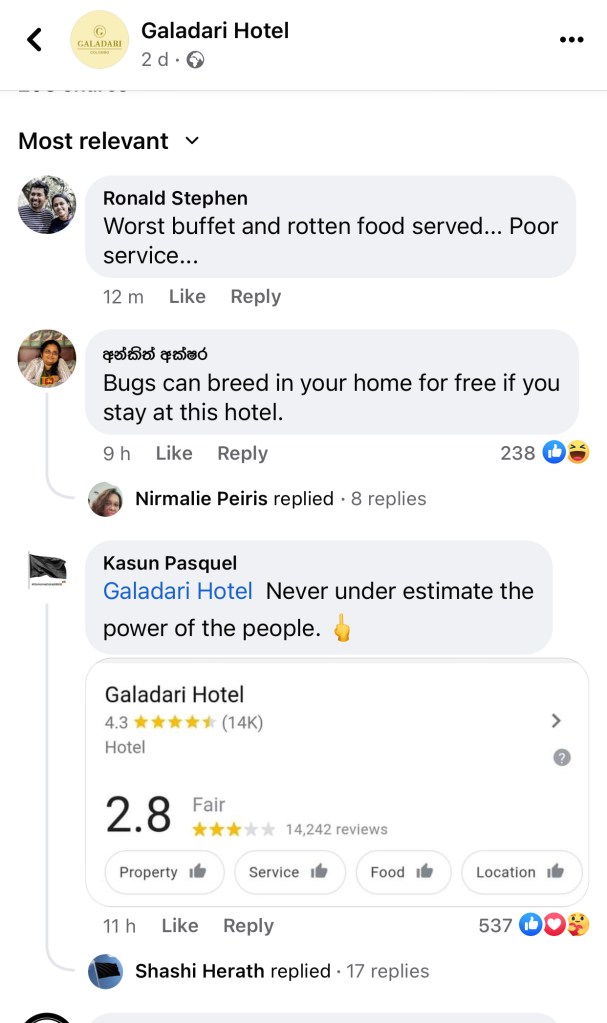 Protests have hit Colombo recently and social media users have alleged that the hotel sided with police in removal of structures at the protest site in the vicinity.