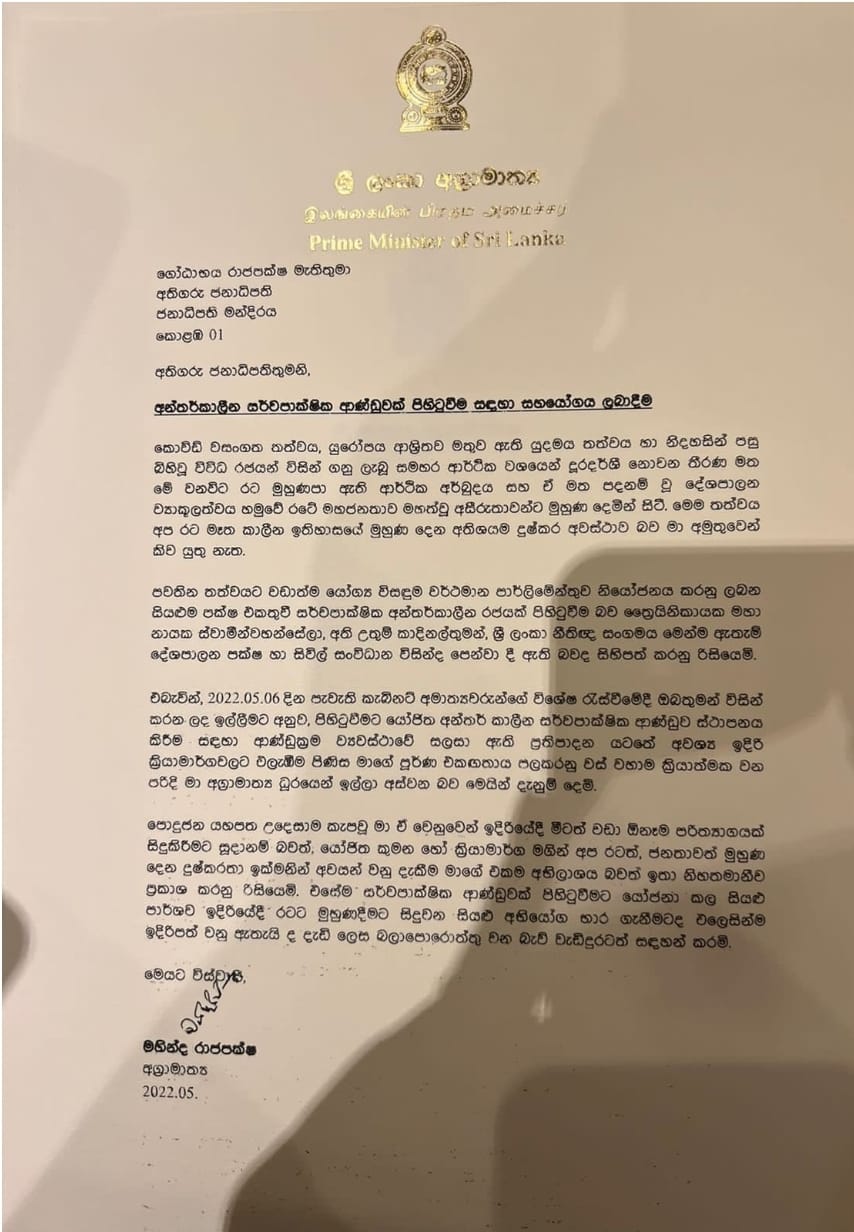 However, following several discussions among the ruling Sri Lanka Podujana Peramuna party (SLPP) and its constituents parties, the Prime Minister has decided to resign from his designation.