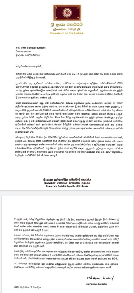 President in his letter says since the Opposition Leader had rejected earlier offers he had discussed with other party leaders and had already decided to appoint Ranil Wickremesinghe as the Prime Minister. The President also says Opposition Leader was late to take a decision to become or accept Prime Minster’s post.