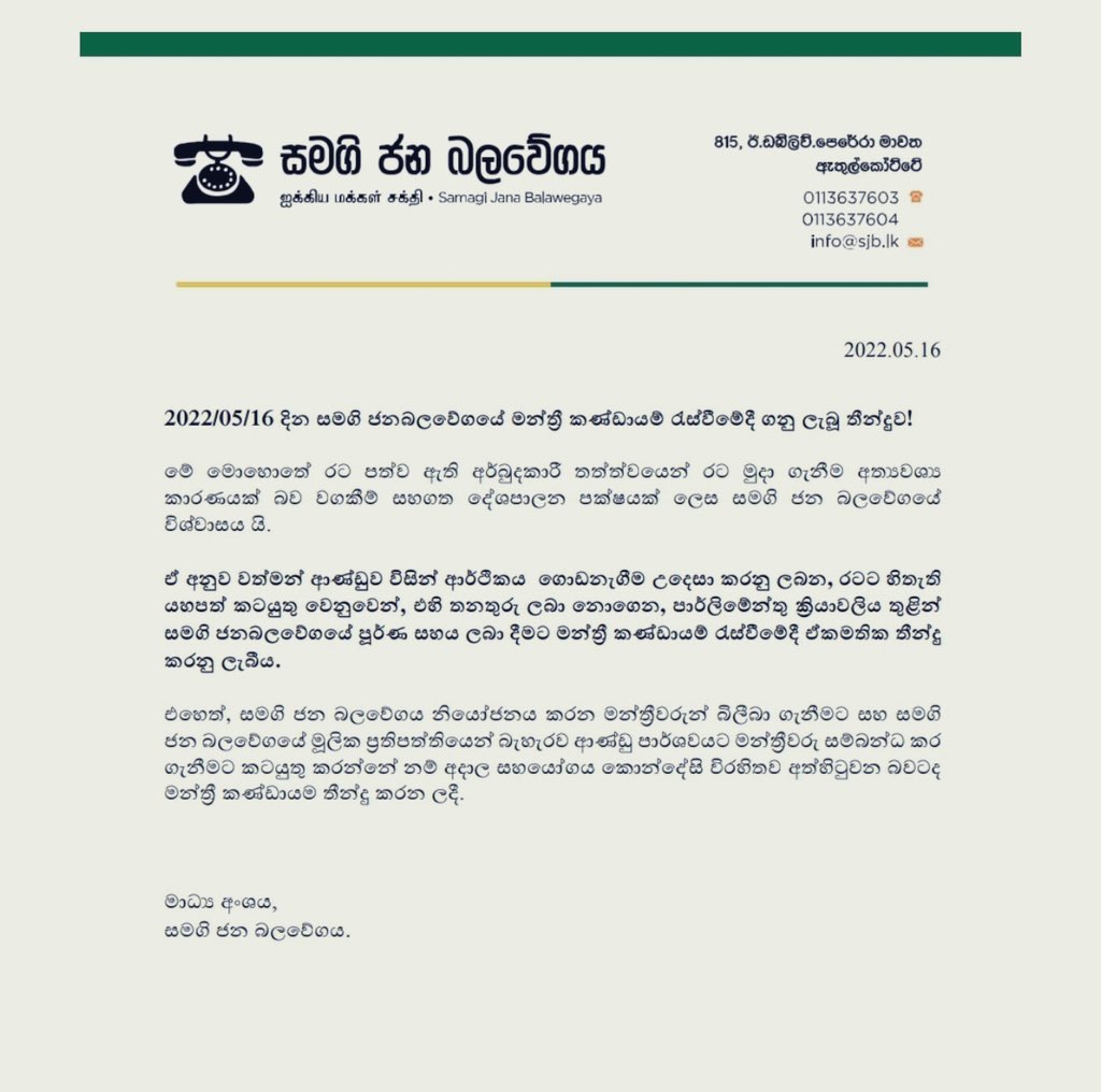 SJB states that it was unanimously decided at their meeting of the Parliamentary Group to provide their full support through the parliamentary process, without taking up posts for the economic development activities that are beneficial to the country, implemented by the new government.