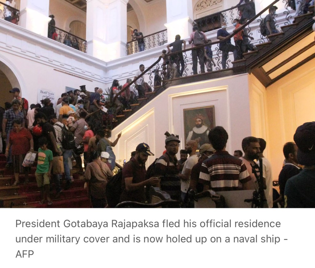 At the nearby Presidential Secretariat, Rajapaksa’s office, protesters have broken down the iron fences and captured the main lobby where they opened a makeshift library on Sunday.