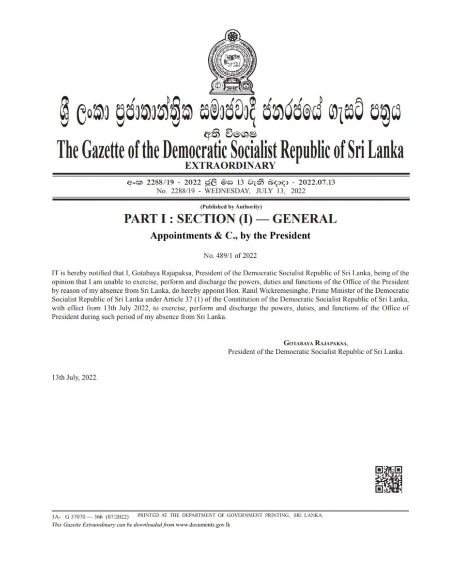 Gazette Extraordinary published by the President, appointing Prime Minister Ranil Wickremesinghe to exercise, perform & discharge the powers, duties & functions of the Office of President with effect from 13 July 2022.