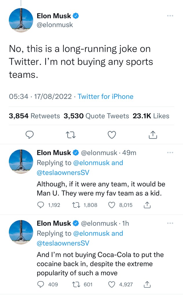 “No, this is a long-running joke on Twitter. I’m not buying any sports teams,” Musk clarified.