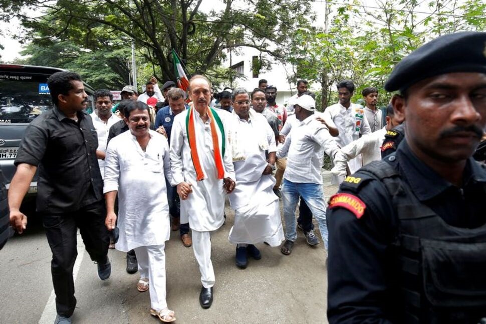 FILE PHOTO: India’s main opposition Congress party’s leaders K. C. Venugopal (2-L), Ghulam Nabi Azad (C) and outgoing Chief Minister of the southern state of Karnataka Siddaramaiah lead a protest against India’s ruling Bharatiya Janata Party (BJP) leader B.S. Yeddyurappa’s swearing-in as Chief Minister of the southern state, in Bengaluru, India, May 18, 2018. REUTERS/Abhishek N. Chinnappa/File Photo