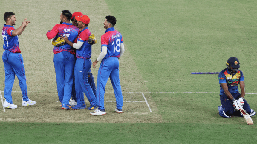 Afghan players celebrate dismissin Sri Lanka’s Maheesh Theekshana (R) during the Asia Cup Group B match between Sri Lanka and Afghanistan at the Dubai International Cricket Stadium in Dubai on August 27, 2022. Photo: AFP