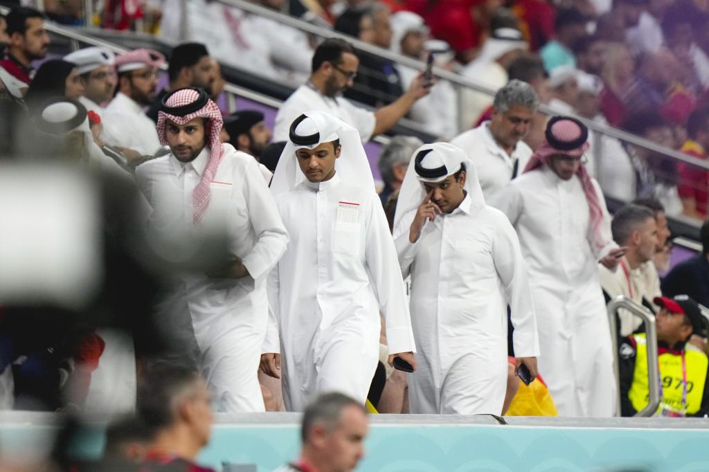 Spectators leave the stands before the end of the second half of the World Cup group E soccer match between Spain and Germany, at the Al Bayt Stadium in Al Khor , Qatar, Sunday, Nov. 27, 2022. (AP Photo/Luca Bruno)