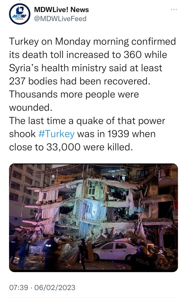 By 6.30am on Monday morning, Turkey confirmed its death toll increased to 360 while Syria’s health ministry said at least 237 bodies had been recovered. Thousands more people were wounded. The last time a quake of that power shook Turkey was in 1939 when close to 33,000 were killed
