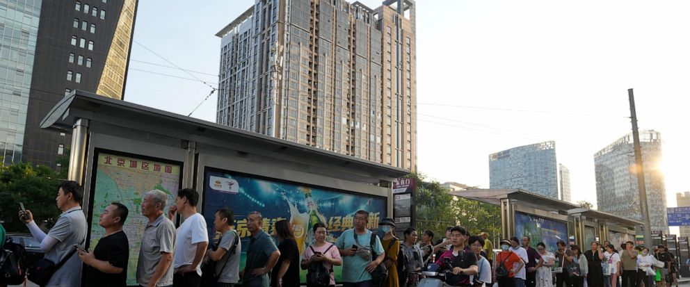 Residents line up for public transportation in Beijing, Tuesday, Aug. 15, 2023. Chinese leader Xi Jinping has called for patience in a speech released as the ruling Communist Party tries to reverse a deepening economic slump and said Western countries are “increasingly in trouble” because of their materialism and “spiritual poverty.” (AP Photo/Ng Han Guan) ASSOCIATED PRESS