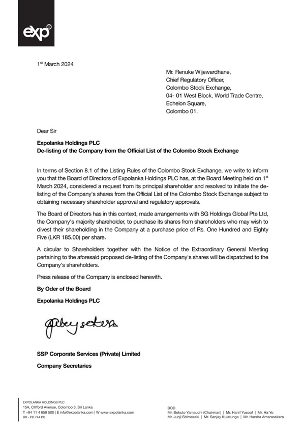 “Expolanka Holdings PLC has, at the Board Meeting held on 1st March 2024, considered a request from its principal shareholder and resolved to initiate the de-listing of the Company’s shares from the Official List of the Colombo Stock Exchange subject to obtaining necessary shareholder approval and regulatory approvals,” the company said in a stock exchange filing.