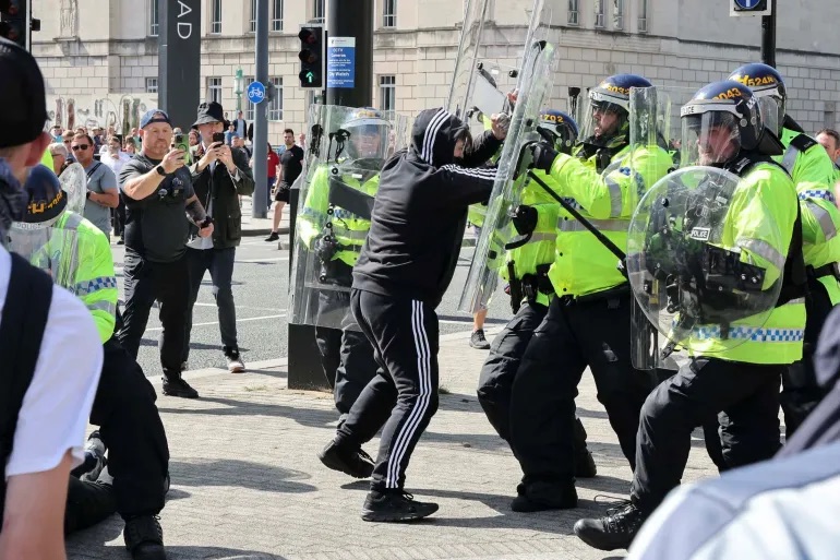 Police officers and demonstrators clash during an anti-immigration protest in Liverpool, UK [Belinda Jiao/Reuters]