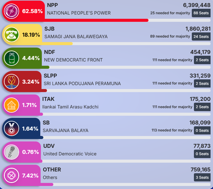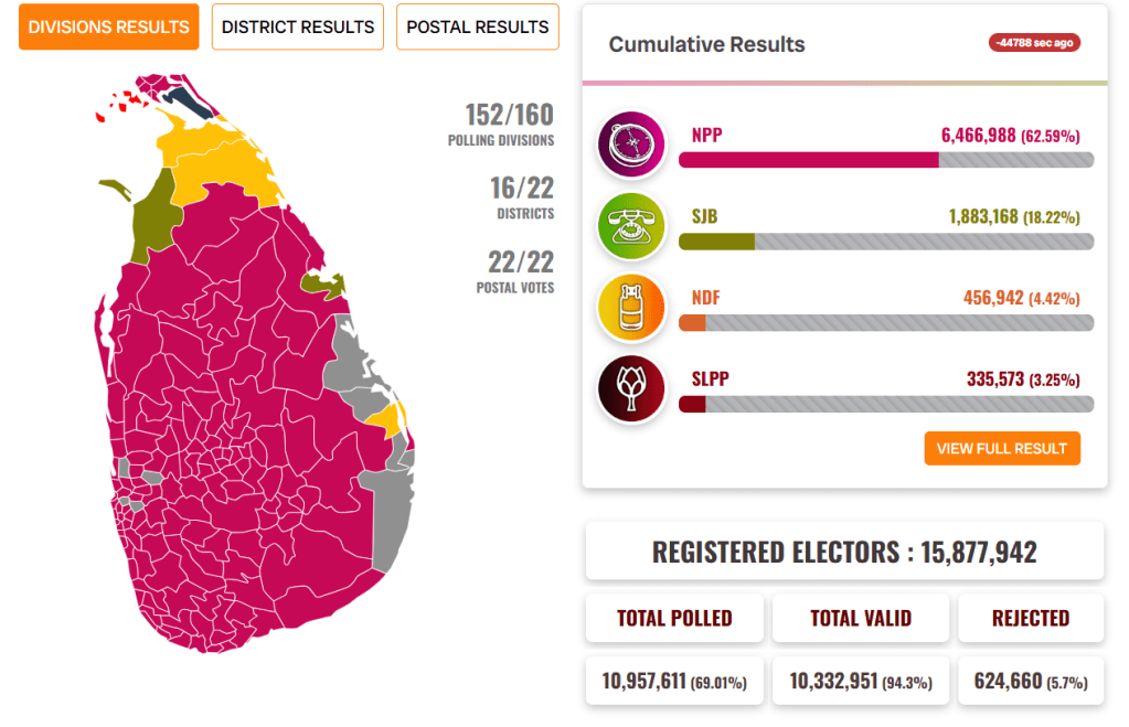With more than half the ballots in Thursday’s parliamentary elections counted, Dissanayake’s National People’s Power (NPP) coalition party had taken an unassailable lead with 63 percent of votes, Election Commission results showed.